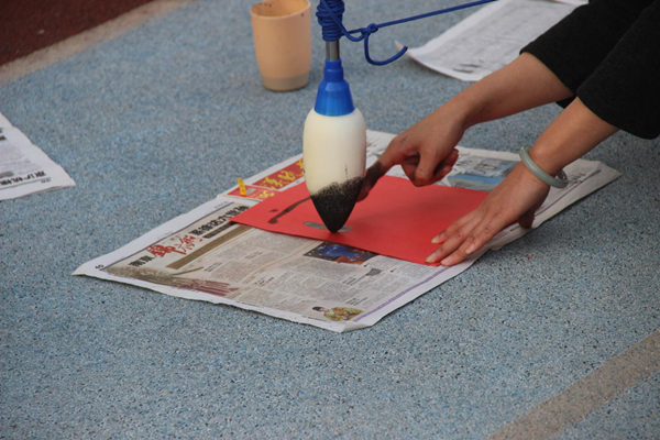想用好这样一支“毛笔”可不是一件容易的事情,大家都纷纷开始钻研起来如何操纵这支“毛笔”如何用它写出一首专属自己队伍的诗,队员们不顾被墨汁弄脏的双手,纷纷热情昂扬地投入到诗句的完成中。郭老师和卓老师也情不自禁向各队队员提出自己的见解。