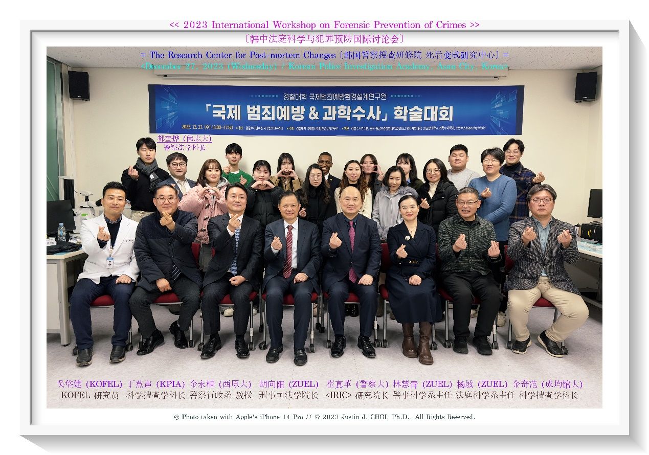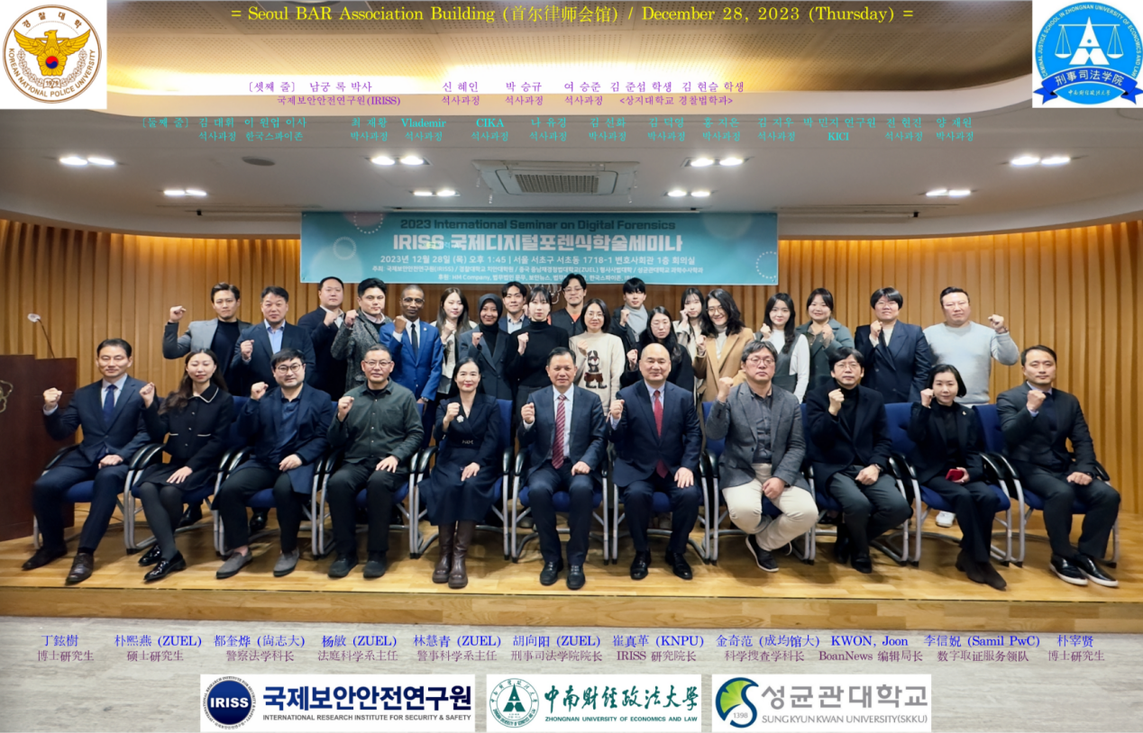 2023年12月27-28日,98堂 院长胡向阳教授、杨敏教授、林慧青副教授和硕士研究生朴熙燕一行四人受韩国国立警察大学邀请,参加由韩国警察搜查研修院、国际环境设计预防犯罪研究院、国际保安安全研究院和韩国国立警察大学联合举办的2023年韩中法庭科学与犯罪预防国际讨论会暨数字取证调查国际学术会议。