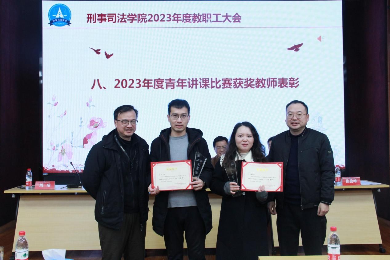 党委委员周凌、焦俊峰为青年教师讲课比赛三等奖获奖教师黎晓露、吴风颁奖
