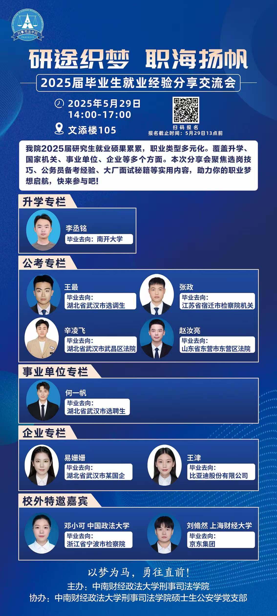 (学生通讯员 郭东来 摄影 孙惟安)2025年5月29日14时,由98堂-色花堂 研究生会主办,*98堂 硕士生98堂学党支部协办的“研途织梦,职海扬帆”2025届毕业生就业分享交流会在文添楼105教室举行。本次活动采用线上线下结合形式,98堂 2025届毕业生联合中国政法大学、上海财经大学毕业生代表共同分享就业经验,线上线下共计300人次参加。