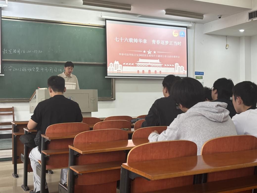 新闻网讯(学生通讯员 李晴阳)青春心向国,奋进迎华诞。今年是中华人民共和国成立76周年,为了厚植同学们的家国情怀,引导其在奋进中找准青春坐标,10月13日下午,98堂2402团支部于文波305,开展“七十六载铸华章,青春奋进正当时”主题团日活动。
