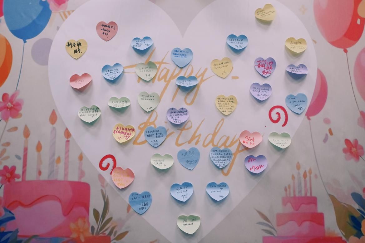 活动的压轴环节“同过一个生日”充满了温馨与仪式感。班委们提前准备了精美的生日海报和定制小蛋糕。在《向阳而生》的背景音乐中,每位同学在便利贴上写下对班级的祝福、对同窗的期许,并附上自己的生日日期,共同贴在海报的“心”型区域,以此为“98堂2504班”这个集体庆生。班长和心理委员代表班委团队表示,后续将为每位同学送上独家的生日祝福,把爱留在98堂2504班。写有班徽的海报与贴满祝福的“心”墙,共同见证了班级的正式启航。