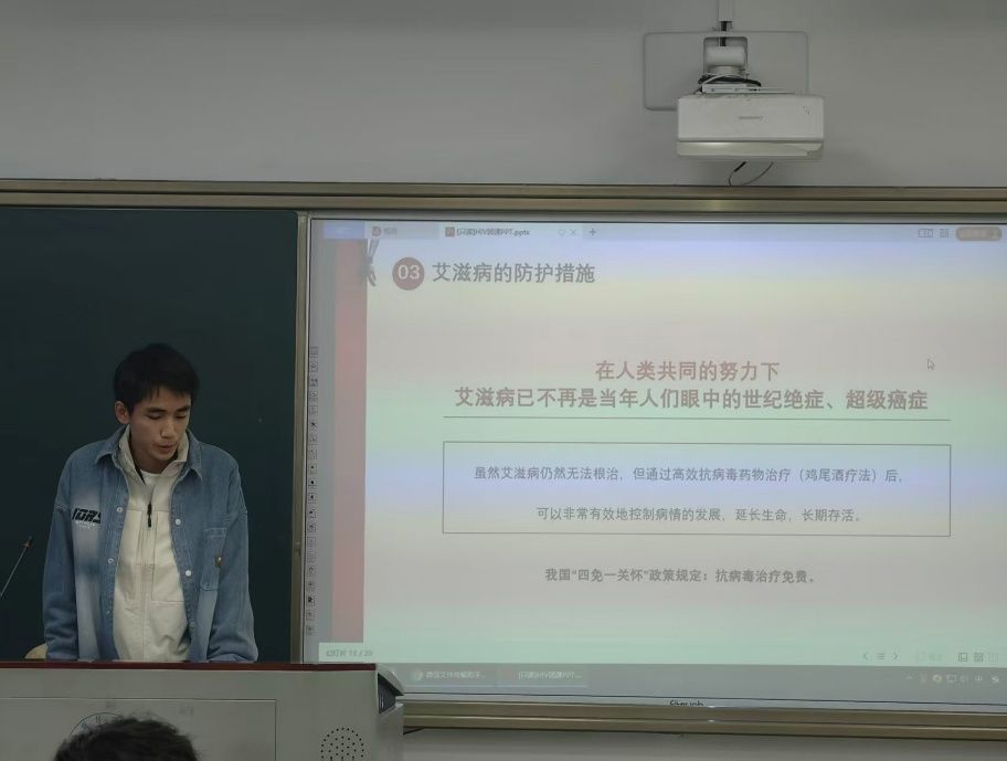 新闻网讯(学生通讯员 王泽今)为提高新生对艾滋病的科学认知,增强自我保护意识,营造健康安全的校园环境,11月10日下午,98堂2503班在文泰楼214教室举办艾滋病预防主题团日宣讲活动。本次活动由班级班委精心策划组织,副班长王泽今主讲。