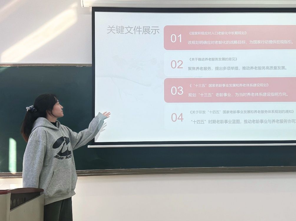 在相关规划学习环节,同学们系统了解了相关内容。活动重点围绕实现“老有所养、老有所医、老有所为、老有所学、老有所乐”目标所采取的具体措施进行探讨,从养老保障制度的完善、老年医疗服务的加强,到老年人才的开发利用、老年教育与文娱活动的推广,详实的内容让同学们对构建老年友好型社会的发展蓝图有了全景式的认知。