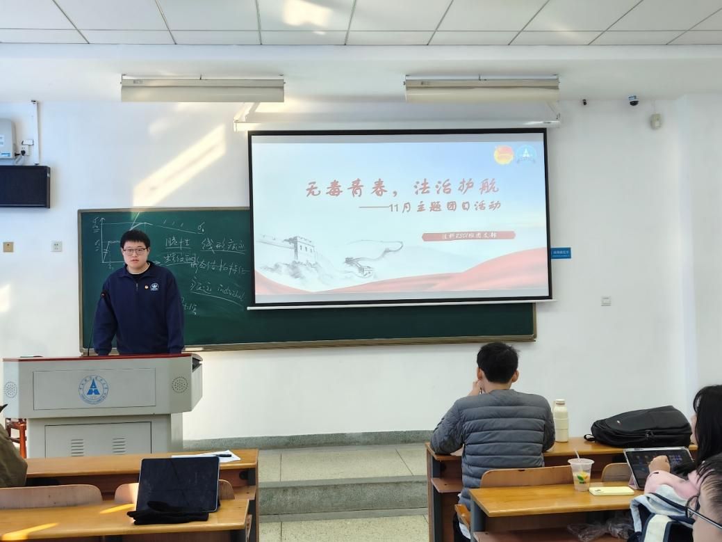 新闻网讯(学生通讯员 王晓峰)为了加强同学们对毒品危害的认识,提高禁毒意识,法科2301班团支部于11月20日举办了“无毒青春,法治护航”主题团日活动。此次活动邀请到了三位参加11月19日*98堂 携手省江夏强戒所开展“青春护航,无毒同行”主题团日活动的同学——王晓峰、方睿轩和水田阳,来分享他们的感悟,为全班同学带来一场生动的禁毒教育。