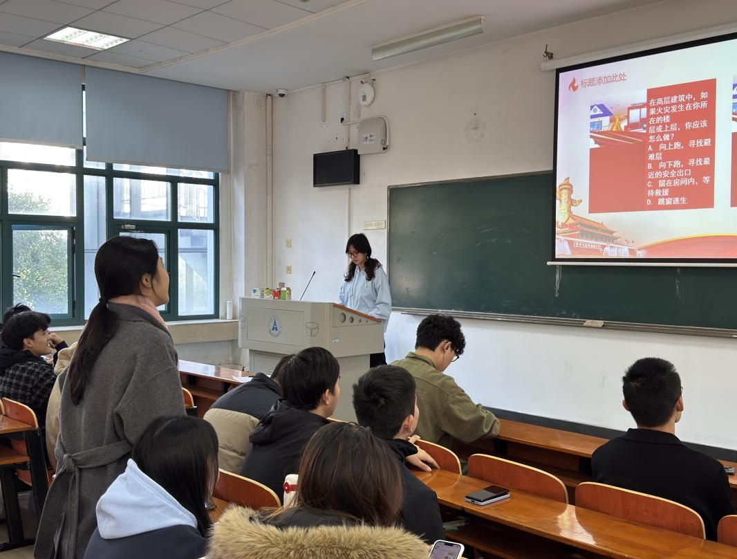 随后,团支书蒋承洋带领大家开展消防安全知识互动问答与实践探讨,围绕火灾报警流程、逃生路线选择、灭火器使用规范等核心内容展开趣味抢答,重点学习了油锅起火、电器火灾等常见火情的正确处置方法。